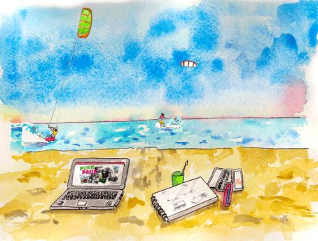 Notre principal spot est la plage de Saint Aygulf. Au mois de Juin, quand il y avait encore du vent, il m’est arrivé d’y aller plusieurs fois seule avec les 3 petites ; c’est la genèse du dessin posté sur le forum de flysurf.com « On arrive les kites ».