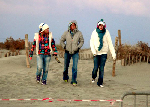 Mel / Clem / Mathilde : le Pink Pack en mode « il fait fresh » sur fond de Canigou enneigé. On avait beau ne pas regarder, la neige à l’horizon n’arrangeait pas nos affaires de frilosité !!!