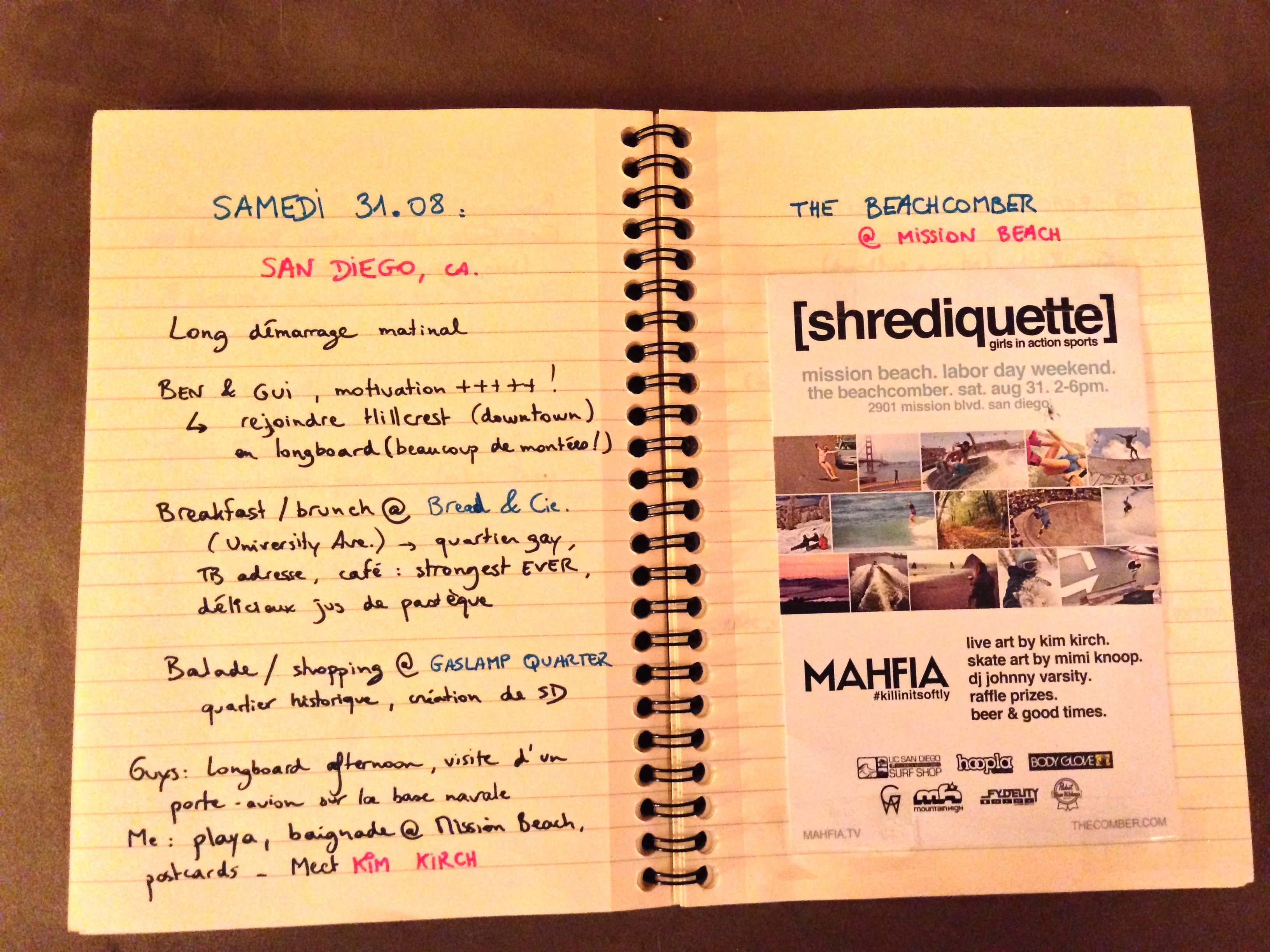 Après le désert, la chaleur (humaine et climatique), on reprend la route, 7h de route à travers le désert de Mojave, ponctuée de très nombreuses pauses dans les différents Starbucks Coffee attendus comme le messie par l’unique conductrice que je fus, on respire enfin : San Diego, ville cool, ville de surf, à la frontière mexicaine. Changement radical, retrouvailles avec ma pote Kim Kirch, rencontre avec d’adorables locaux qui nous emmènent surfer à Ocean Beach.