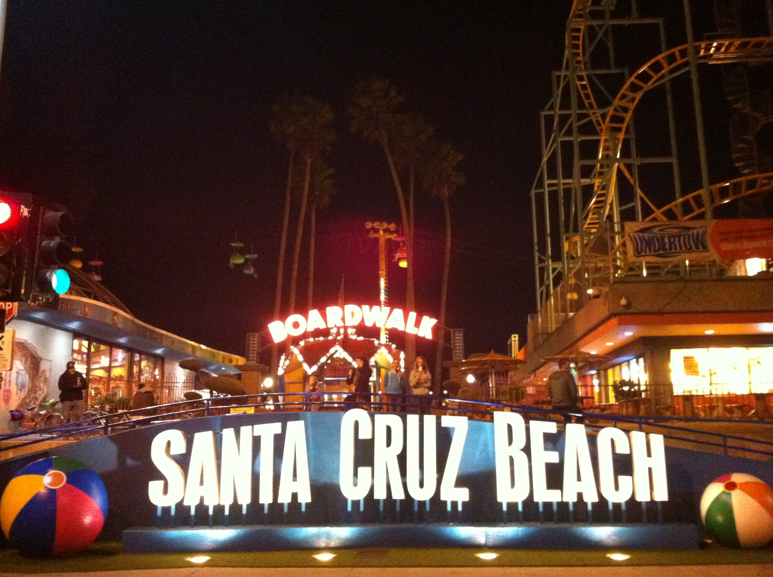 On rejoint ensuite la côte pour rouler sur la mythique route n°1, la Pacific Coast Highway. On frôle la panne d’essence mais on assiste au dorage de pilule des nombreux phoques oisifs du pacifique. Nous arrivons ensuite à Santa Cruz, station balnéaire, mignonne comme tout, des surfs shops à la pelle (on a craqué on s’est tous acheté un cruiser, un Santa cruz of course, et moultes fringues), et un boardwalk occupé par un petite fête foraine mignonne, comme la ville. Après les immenses manèges de Six Flags, on a été ravis de pouvoir profiter des petites attractions à petites sensations pour la maudique somme d’1$ chacune. Mais de nuit, tout de suite, les frissons sont toujours au rendez-vous.
