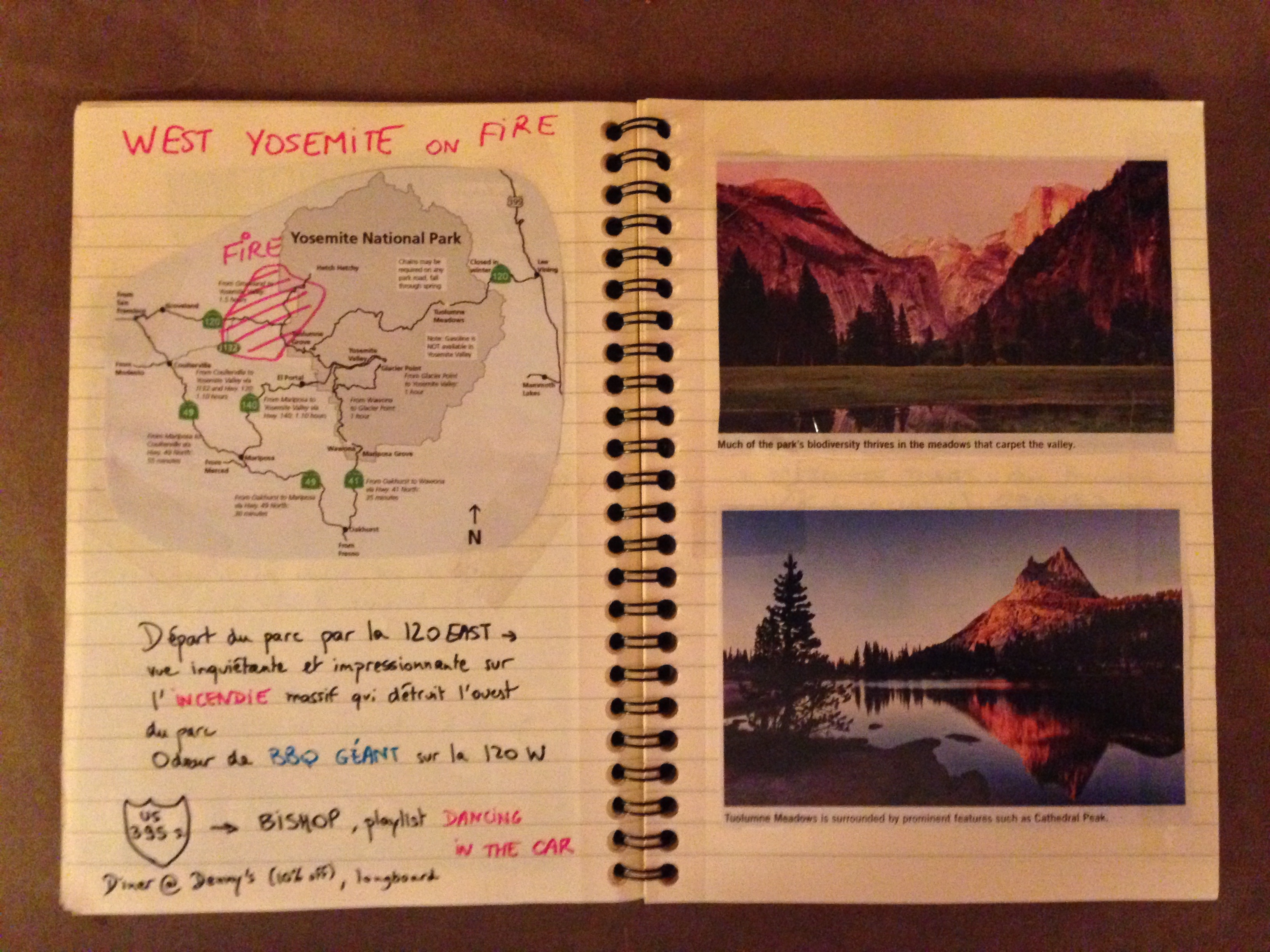 Cap au sud pour traverser le Yosemite Park. On le sait, cela tourne en boucle sur toutes les tv, Le Monde en a même fait un article, et ma mère (très inquiète, mais c’est le rôle d’une maman) nous met en garde : l’ouest du parc est en feu, et il progresse vers le village où se trouvent les hébergements. On est des dingues (enfin on se renseigne quand-même toutes les heures avant de pénétrer dans le parc, pas folles les guêpes !), on y va ! Arrivée nocturne, arrestation par un ranger pour un soit-disant excès de vitesse « ah pardon je roulais à 40 au lieu de 35 je suis vraiment désolée monsieur le ranger, je vais être très prudente à présent » (on ne RIGOLE pas avec un ranger noméo !). Film de mise en garde contre les attaques d’ours qui ruinent une voiture dans laquelle on aurait oublié un M&M’s sous un siège, brossage de dents au bloc sanitaire accompagnés par les coyotes, nuit sous la tente et le lendemain matin, ENORME CLAQUE, limite fracture de rétine devant la beauté des paysages !! Les 2 gars, courageux, sportifs et vaillants s’en vont gravir les montagnes en randonnant, je préfère les rives de la Merced River pour me reposer des loooooongues heures de route et tremper un orteil dans une eau de fonte de glacier à 12°c.