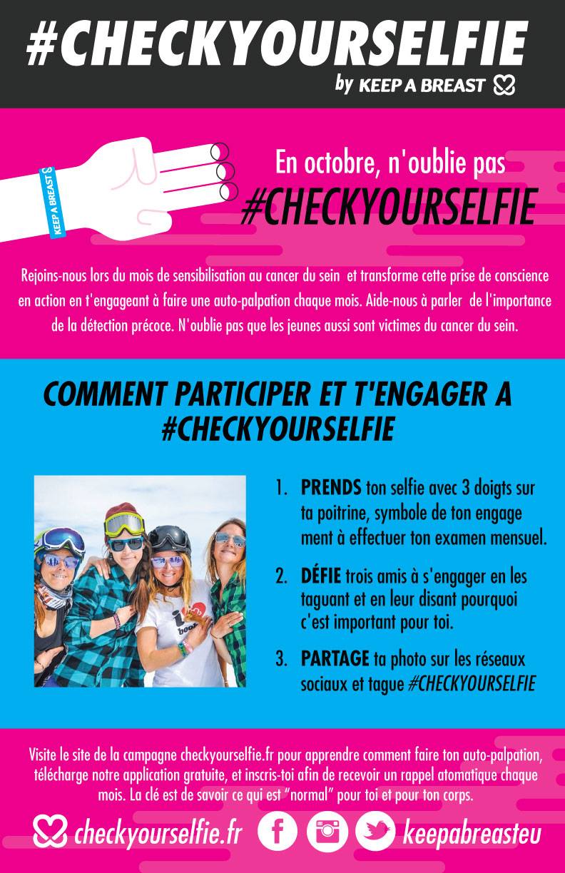 N’oubliez pas leur campagne « #CheckYourSelfie« , mise en place pour vous apprendre à détecter si quelque chose ne va pas sur votre poitrine (ou celle de votre copine messieurs/dames) et finalement peut être, vous sauver la vie… N’hésitez pas à en parler autour de vous, pour soutenir leurs actions et contribuer vous aussi à la prévention !