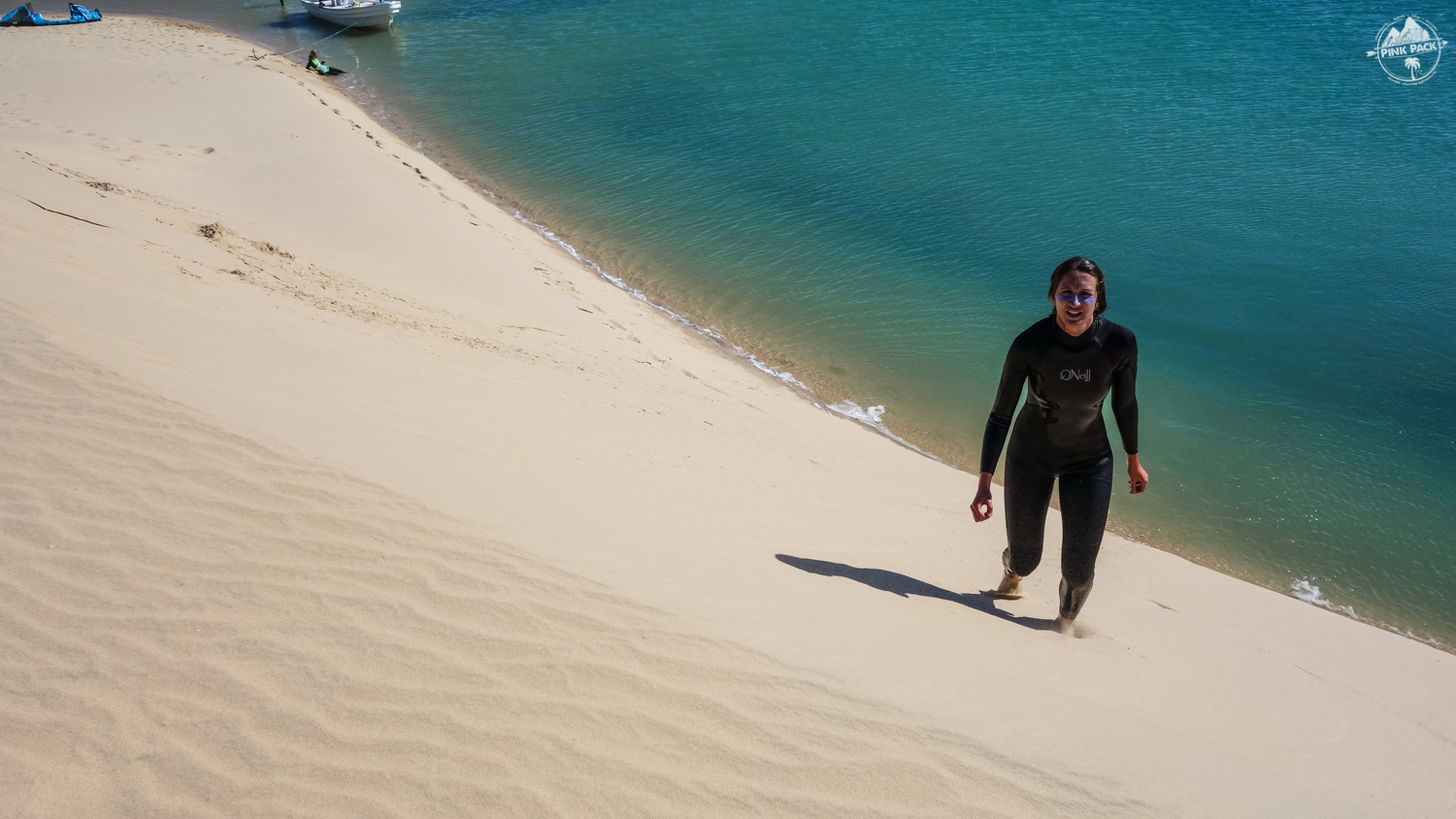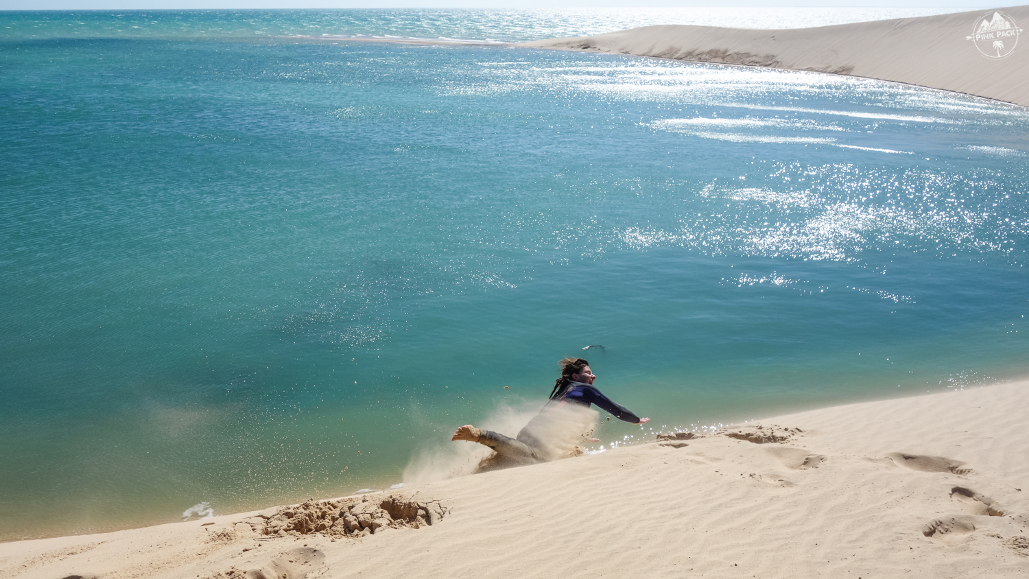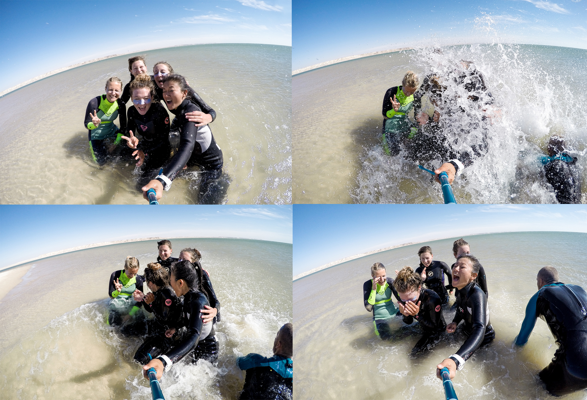 Step 5 : Après la ptite session freestyle, on vient poser son aile quand on veut sur la dune blanche (la plage est grande, aucun souci). On félicite notre Blondie qui s’est surpassée et a bouclé ce downwind comme tout le monde ! On plie le matos et on vient récupérer de l’eau et les Go Pro au bateau de sécu, puis c’est parti pour 1h de rigolade sur la dune !