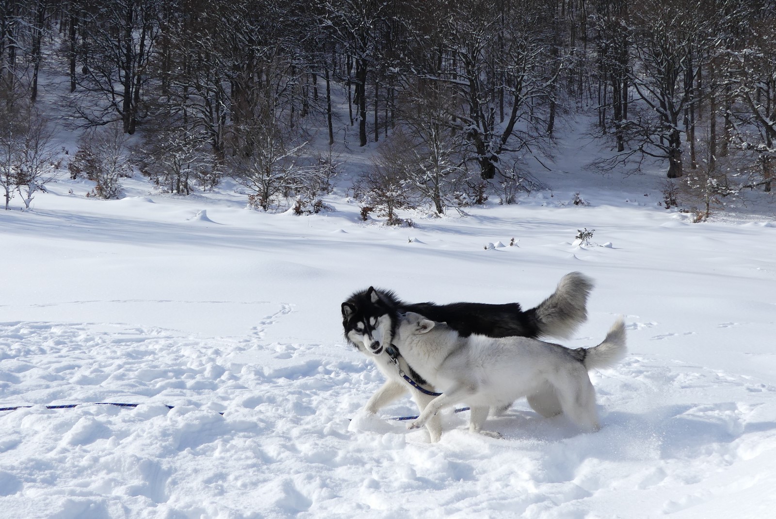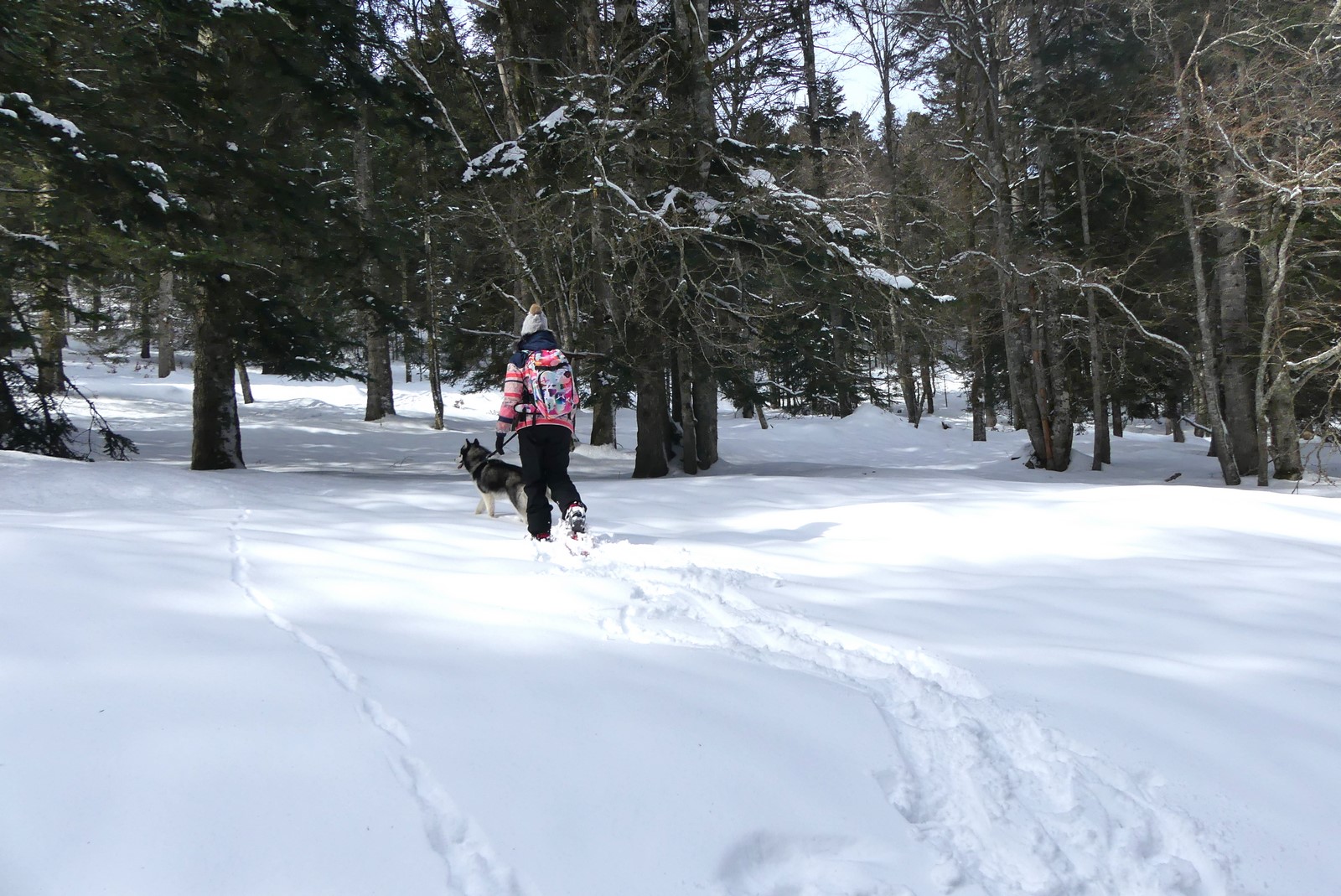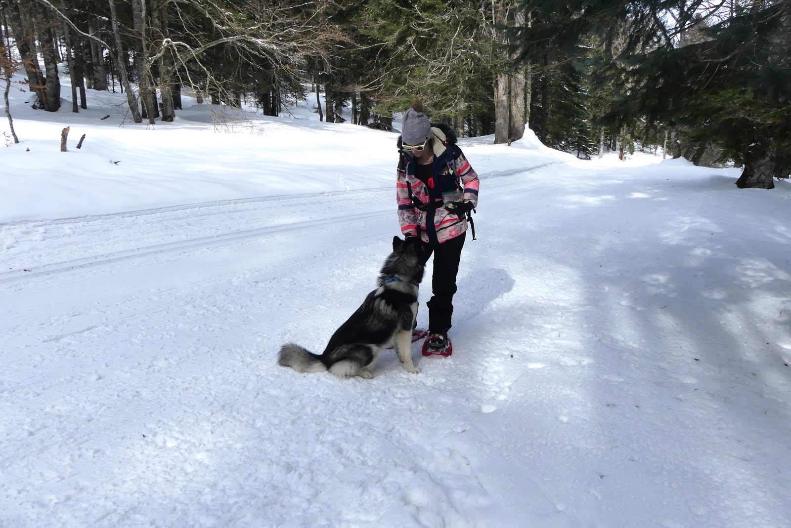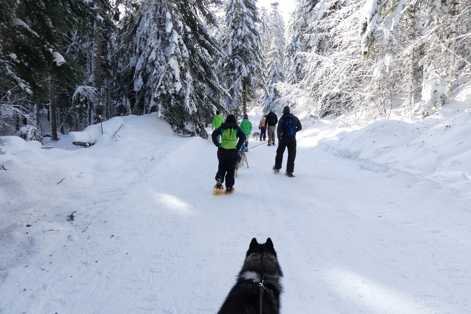 Après tout il « suffit » de mettre un pied devant l’autre ?! Il faut juste s’habituer à marcher avec des raquettes aux pieds, mais ça va assez vite. En fait, avec le chien qui tire (à mort !), le plus dur est de trouver son équilibre, tout en le freinant ! Et oui, il n’y a pas que le chien qui bosse ! On ne peut pas se contenter de faire le cerf-volant au bout de la laisse (enfin, vous faites ce que vous voulez après tout) ! OMG ! Il en faut de la force pour contrer celle du husky…