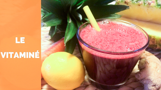 1 tranche d’ananas + 1 carotte + 1/2 orange + 1 betterave + une bonne poignée de myrtilles congelées + 1 citron vert + 1 citron jaune + gingembre frais