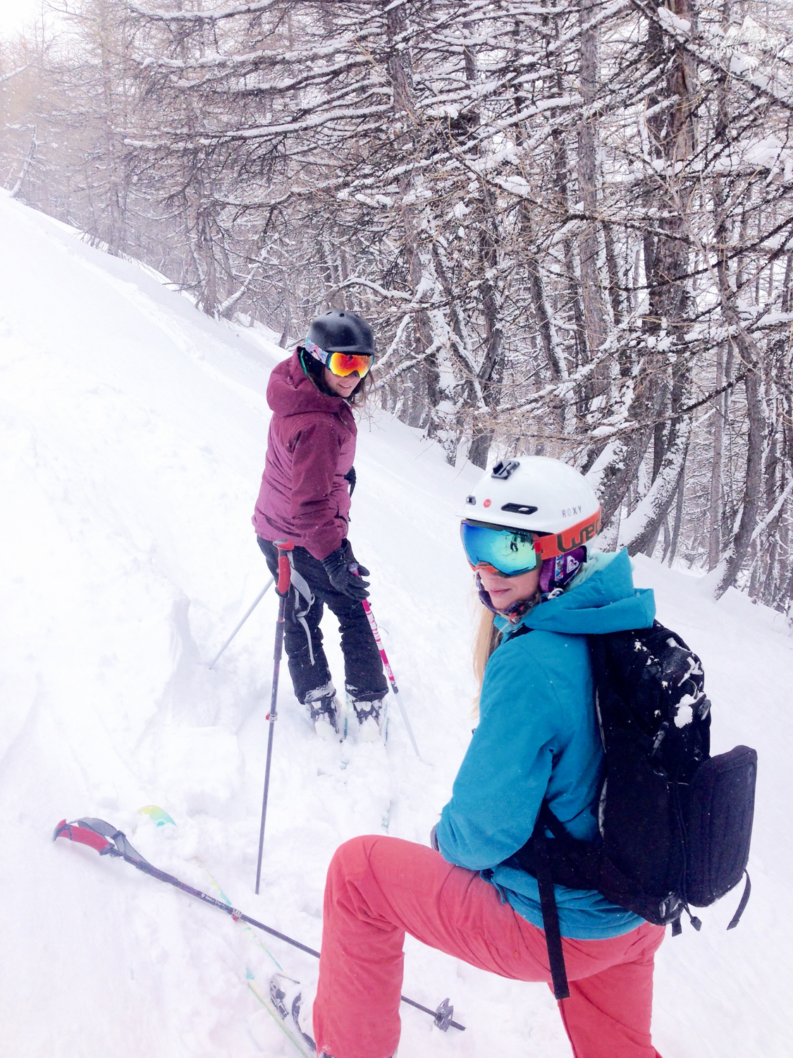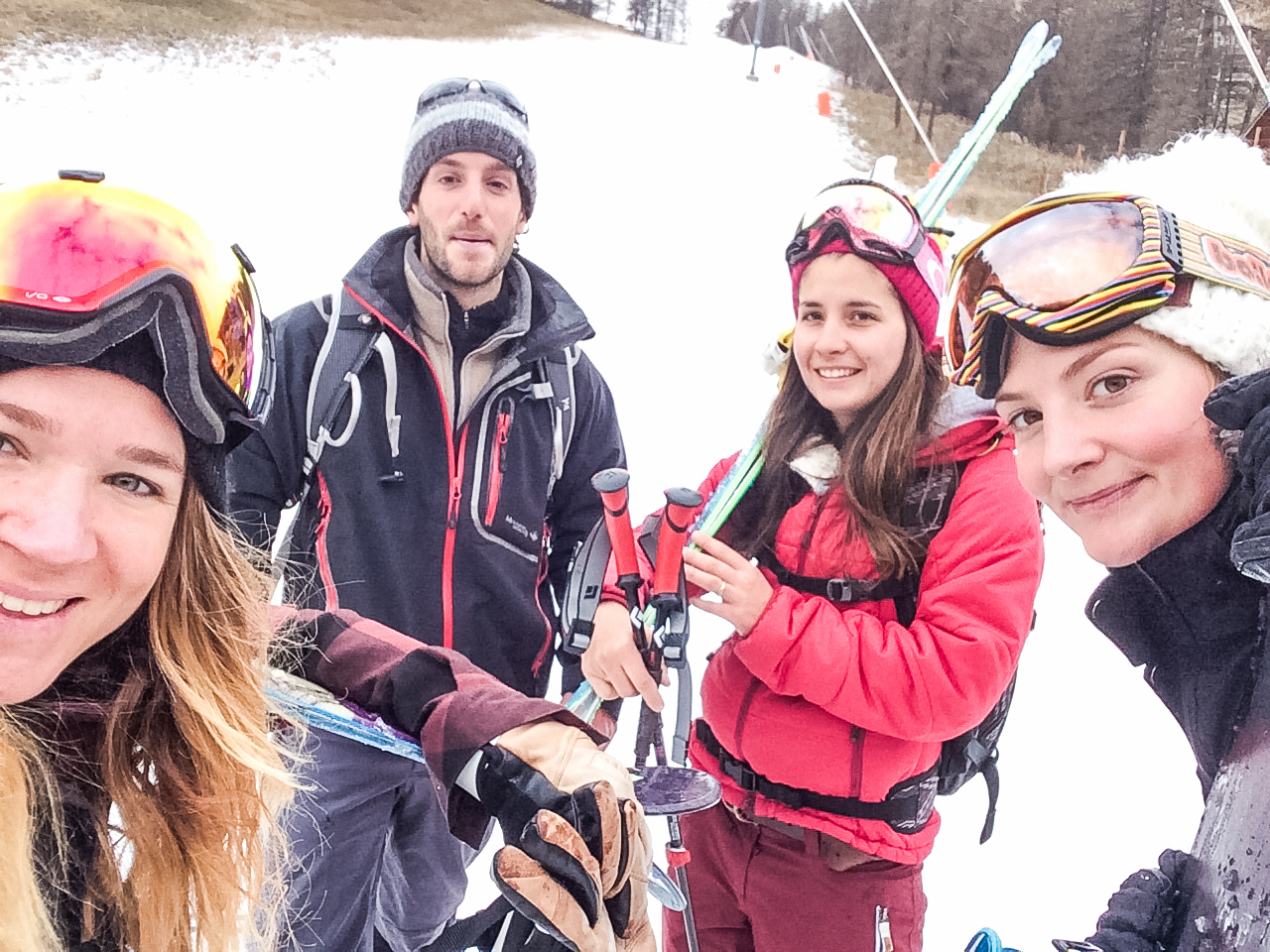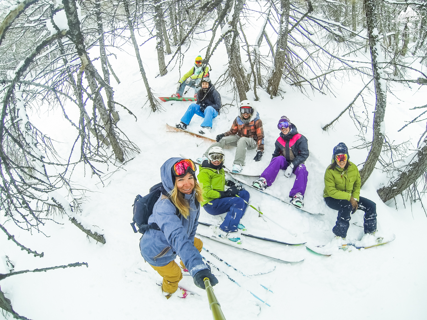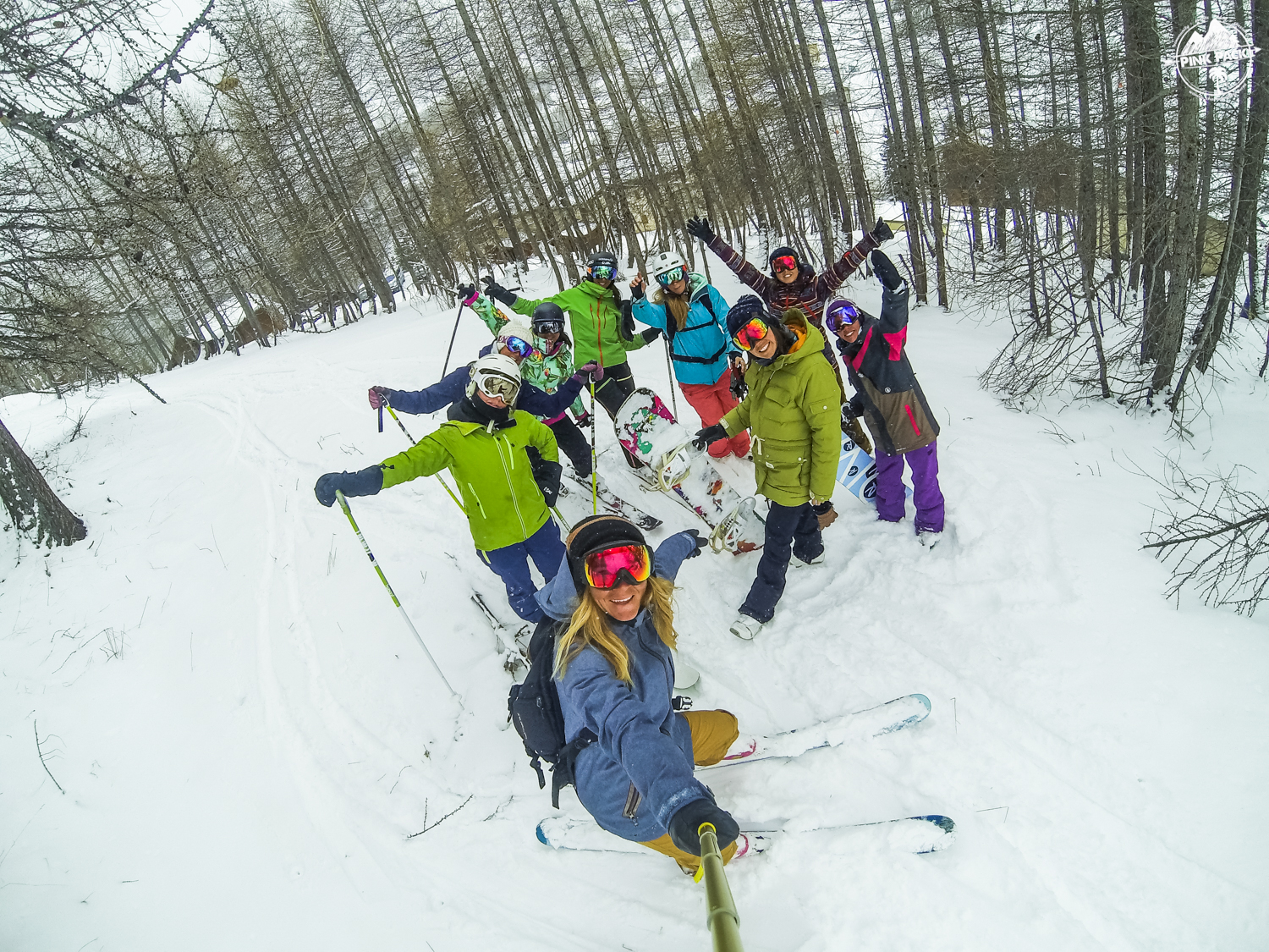 Personnellement, je garde en image de cette journée un run qui a fini dans des bois très très serrés 🙂 (Merci Sabine !!). Je me rappelle avoir regardé toutes mes potes, en snow, en ski, groupées, passer à toute allure entre les sapins. Ce moment aurait bien valu un rush Go Pro, mais pas le temps, on a juste kiffé entre nous !